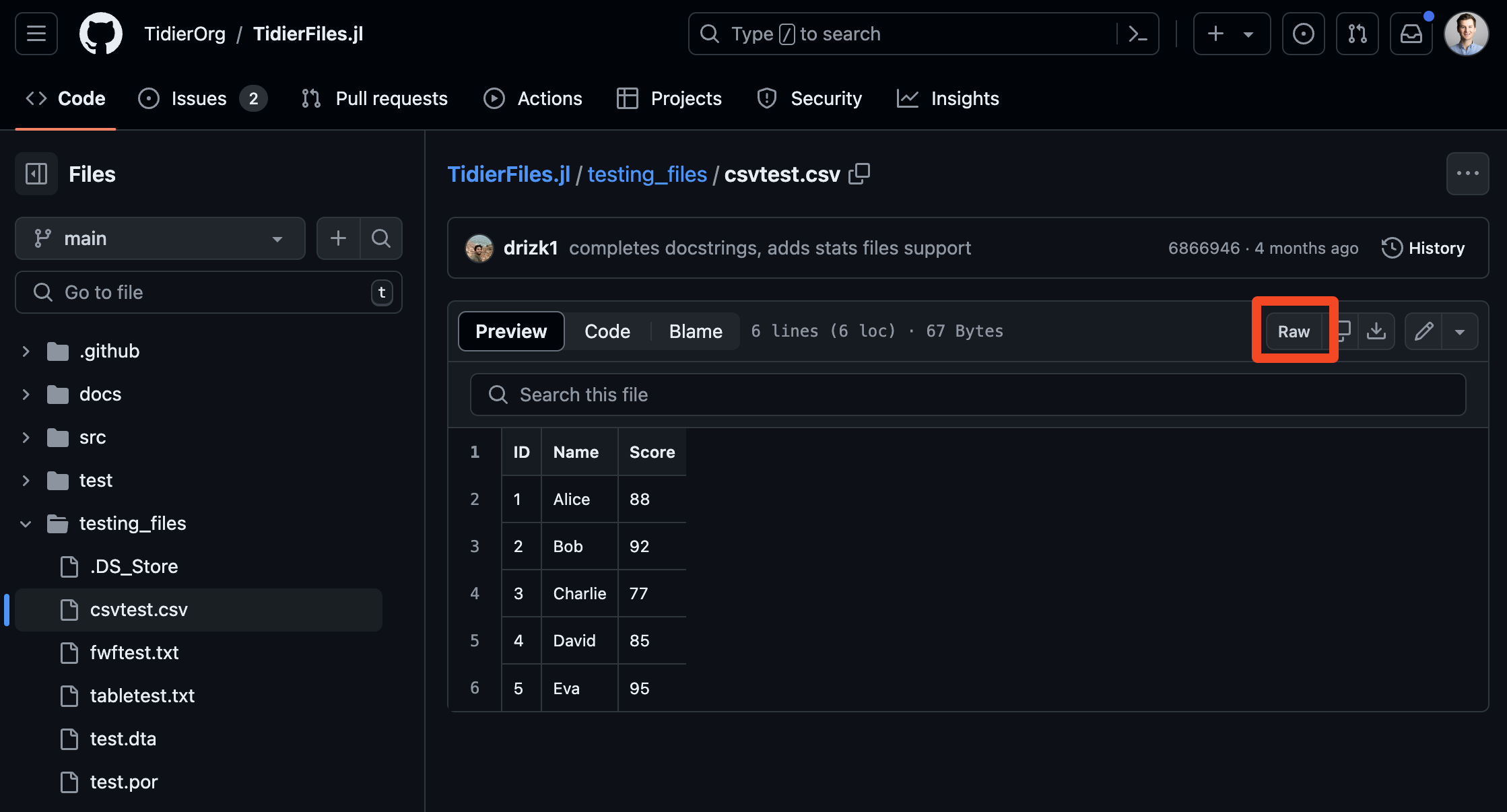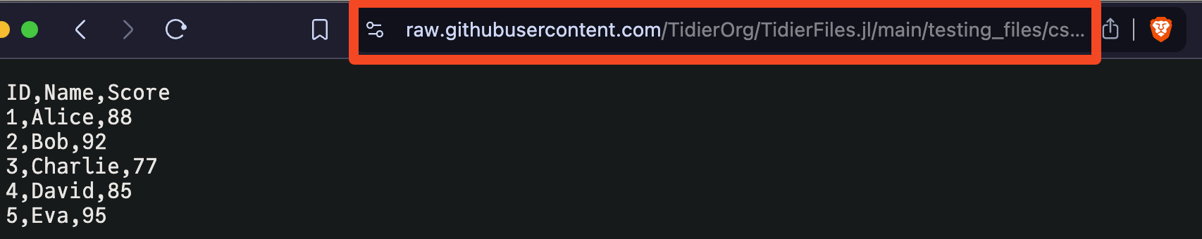 With {TidierFiles} we can read data from URLs that are hosted on the web. To do this, we can use the read_csv() function and pass in the URL as the first argument, instead of a relative filepath. If the CSV or txt file is hosted on GitHub, you can navigate to the file in GitHub, open up the raw version, and pass the URL to the read_csv()/read_delim() function.
